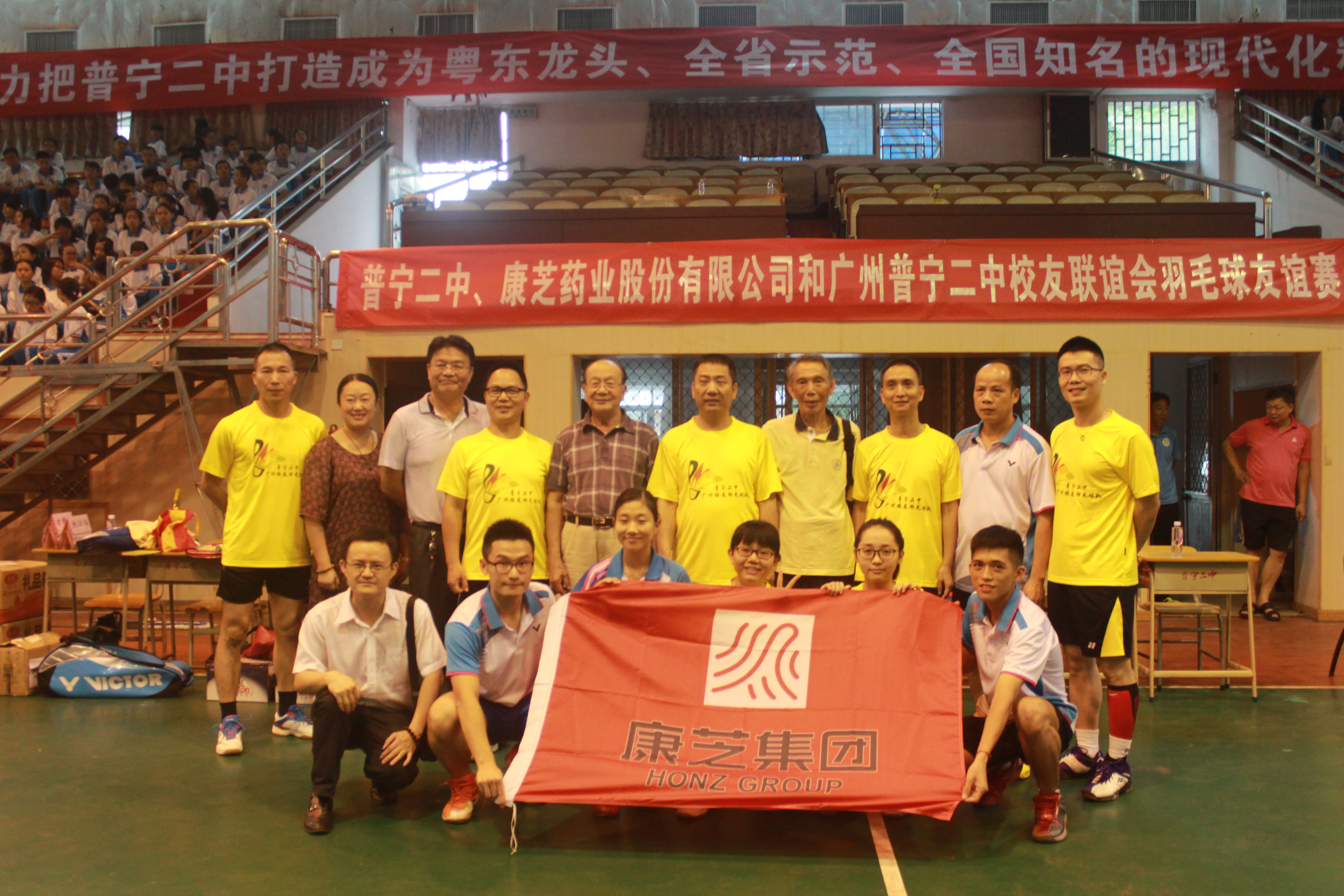 10月8日下午,康芝藥業董事長洪江游先生帶領康芝羽毛球俱樂部成員,風塵仆仆來到其母校普寧二中參加羽毛球友誼賽。當天,以洪江游董事長為首的康芝羽毛球俱樂部,和普寧二中廣州校友聯誼會秘書長羅勇強先生等校友代表組成了聯合代表隊,與普寧二中副校長陳偉旭先生率領的二中代表隊進行了一場精彩對決。